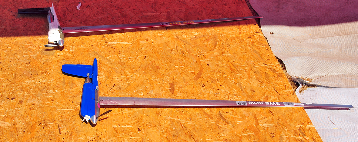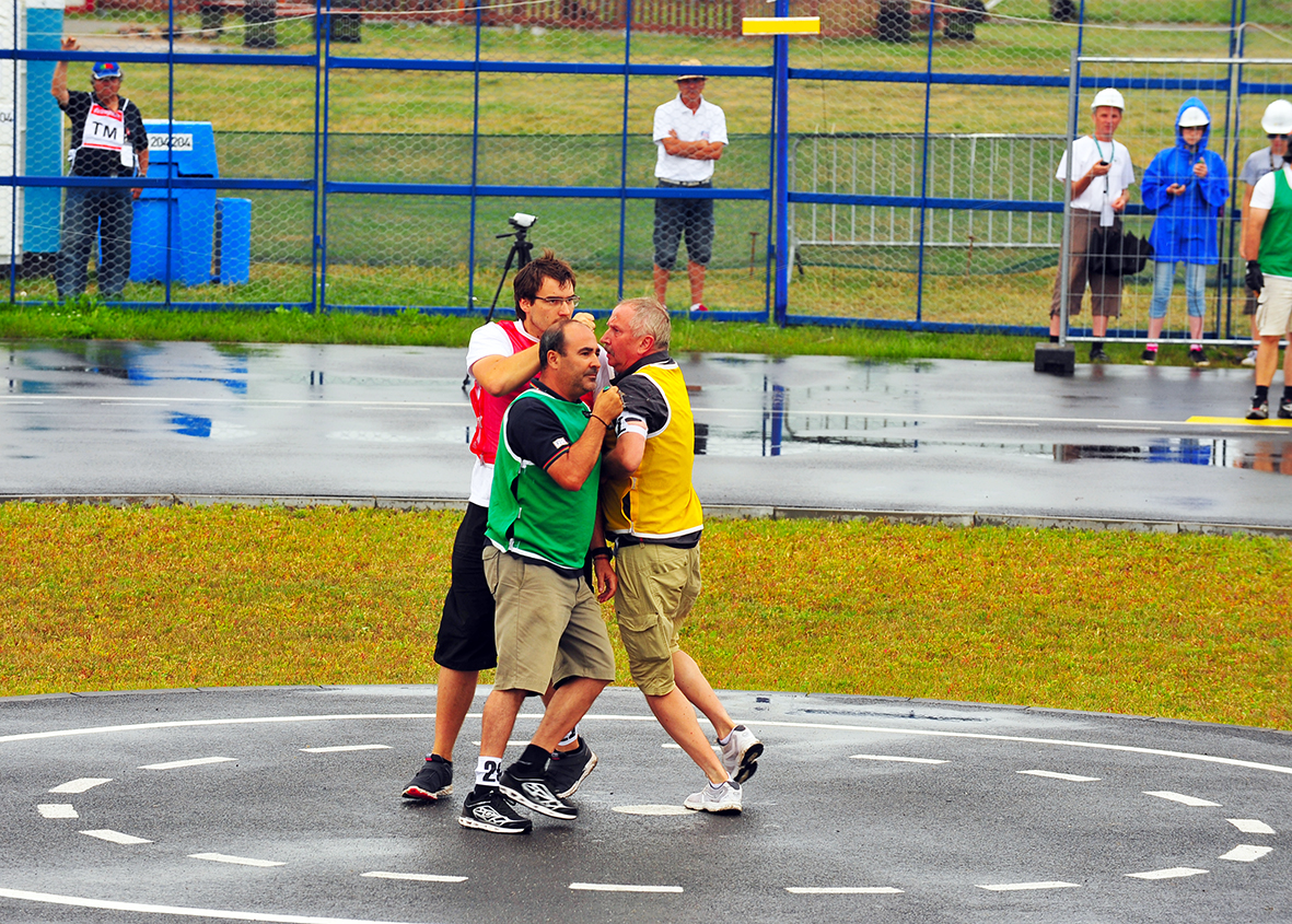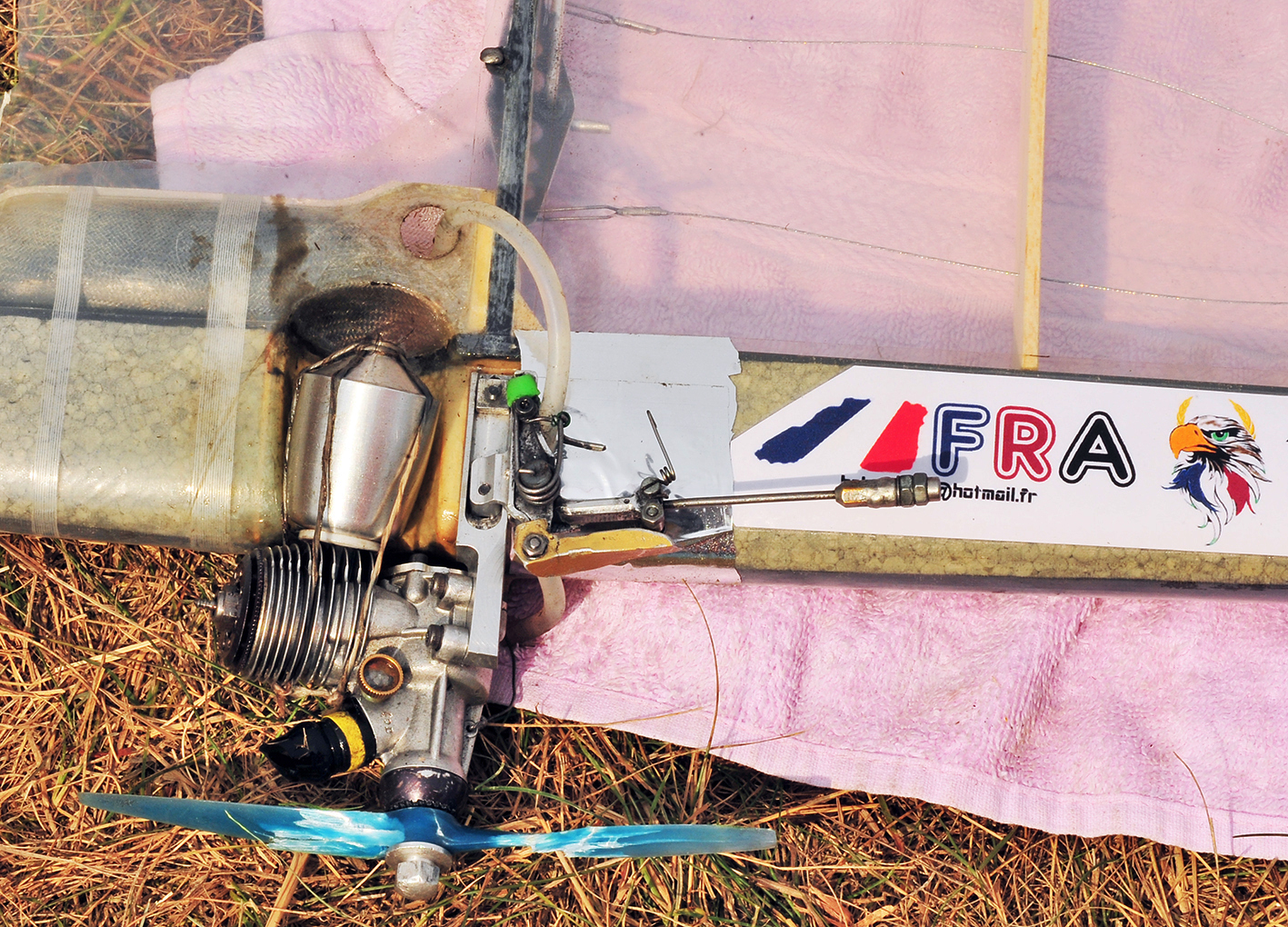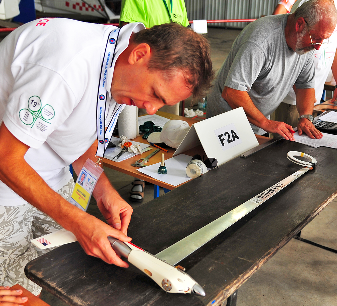 F2D is the combat category where again there are multiple pilots in the circle simultaneously. This time it is two, each with two mechanics on the ground. The aircraft are light in weight and very short from nose to tail so as to maneuver quickly in the air. Each has a 2,5 meter crepe paper streamer attached to the rear of the aircraft by a 3 meter string. Each pilot may attack the other’s aircraft at the streamer only in an attempt to cut the streamer with his or her model’s propeller or wing leading edge. Each cut scores 100 points. Each second the model is in the air scores a point and the match runs for 4 minutes from the starter’s signal to launch the aircraft. At the almost 200 kph speeds of the aircraft, mistakes of the pilots often lead to crash damage so two aircraft are allowed for each match. The mechanics (2 per pilot-contestant) are on the lookout for the crash and will quickly start the second aircraft, retrieve the streamer from the first and attach it to the reserve model before launching. The action is so fast that the new observer frequently cannot see the actual cuts of the streamers as they happen so quickly. Each competitor is allowed two losses before they are eliminated from the contest. The last survivor wins.