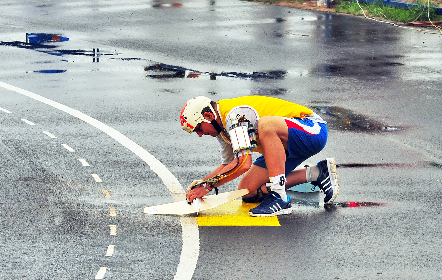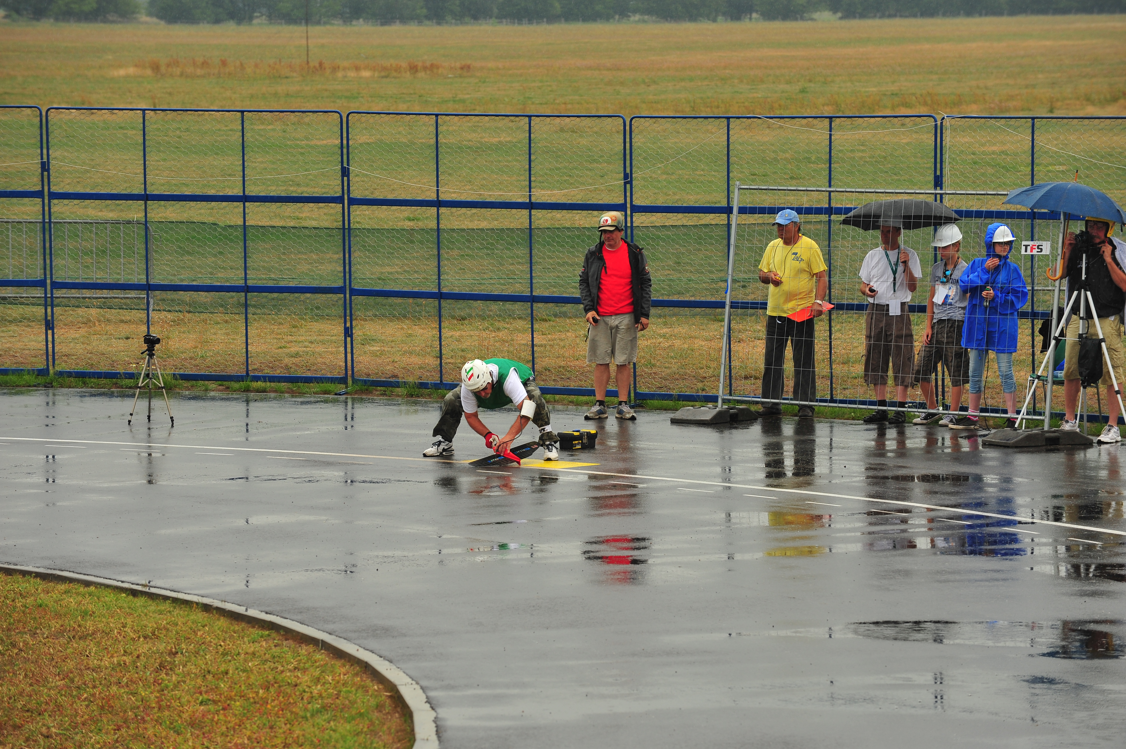 In F2C, the model aircraft race each other with three pilots flying their aircraft in the same circle simultaneously. Each model has a mechanic who starts the engine at the race starter’s signal and catches and refuels the model when it runs out of fuel. In a 10 kilometer (100 laps of the circle) race, refueling is done twice on average because of the mandatory 7.0cc limit on fuel capacity. Speeds of 200 kilometers per hour are achieved and pilots must exercise great skill in overtaking competitors, and in takeoffs and landings, with this degree of model performance. Competition is close and many races are won by tenths of seconds which requires great pit stop skill on the part of the mechanics. Championship caliber mechanics catch the model, refuel it, restart the engine with 1 flick of the propeller, and release it in less than 4 seconds.